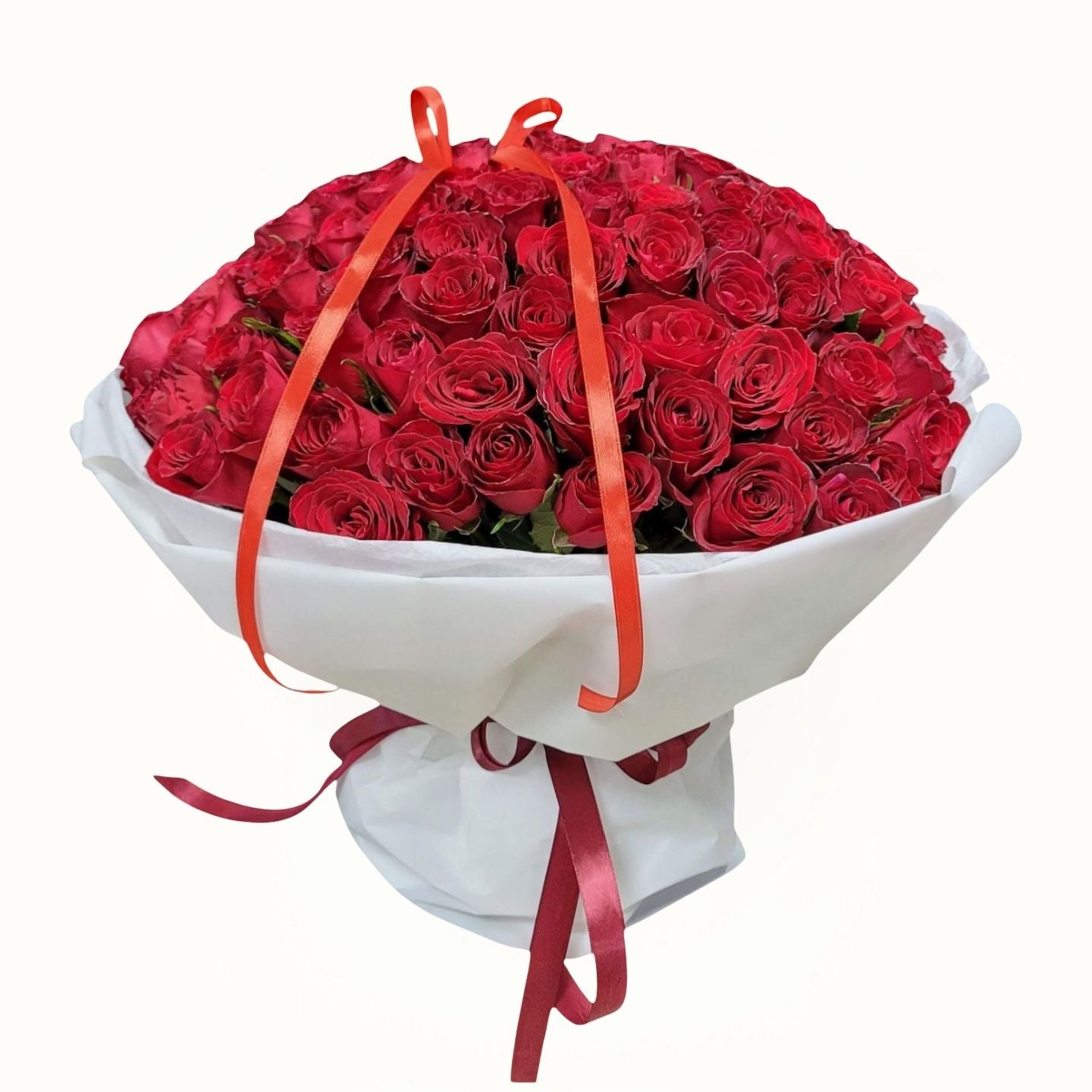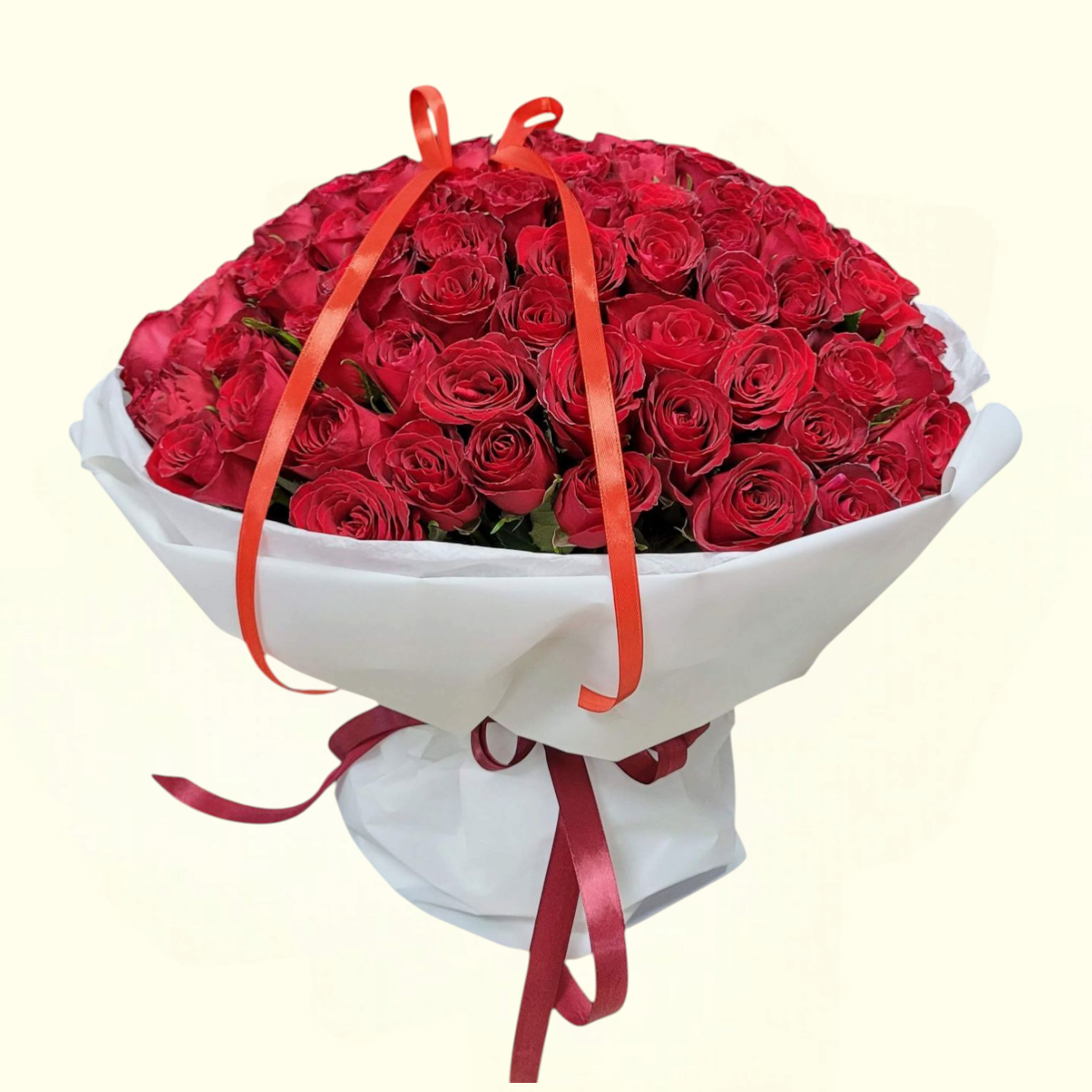 This exquisite bouquet features 55 fresh red roses expertly arranged in a classic round shape. Each bloom is carefully hand-selected to ensure vibrant color and lasting freshness. The bouquet is elegantly wrapped in handcrafted white paper, topped with a striking red ribbon that adds a refined finishing touch. Perfect for expressing deep affection or celebrating special moments with sophistication.