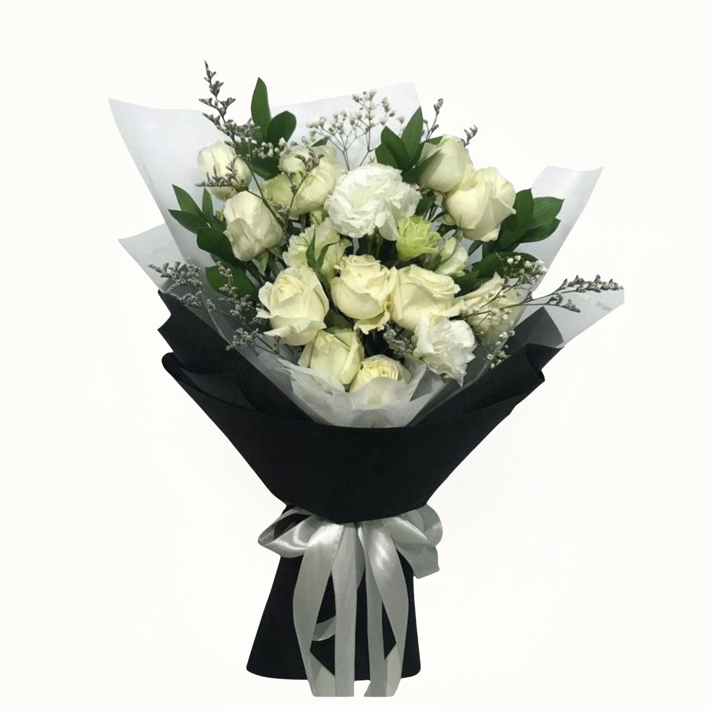 Celebrate new beginnings with the Baby Breath bouquet, featuring 20 fresh white roses complemented by 3 elegant white Clianthus stems, delicate Gypsophila, and lush green leaves. Expertly arranged and wrapped in a sophisticated hand-crafted white and black design, this bouquet offers a timeless and refined expression of purity and joy. Perfect for welcoming a newborn or marking a special moment with understated elegance.