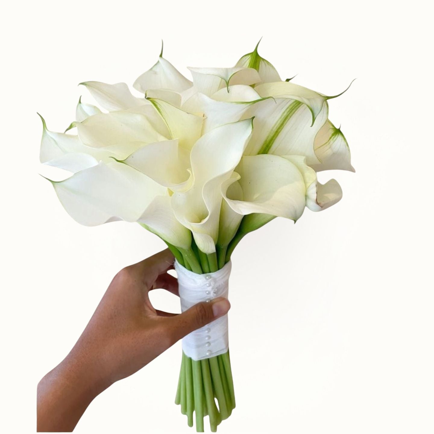 This elegant bridal bouquet features 15 carefully hand-made Kala lilies, beautifully wrapped with a pristine white ribbon. Designed to enhance your special moment, its refined craftsmanship and classic style make it a stunning accessory for any wedding. The bouquet’s delicate arrangement ensures a timeless and sophisticated look, perfect for creating unforgettable memories.