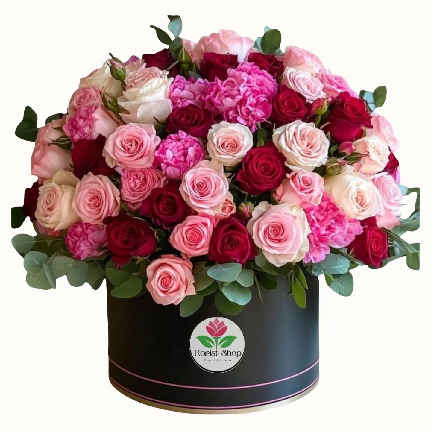 Experience the refined beauty of the Butterfly Box, featuring a stunning mix of 100 fresh flowers. This elegant arrangement includes 30 pink, 30 white, and 30 red roses, complemented by 2 fresh pink hydrangeas and 8 lush green leaves. Perfectly balanced in color and texture, this flower box offers a sophisticated display that brightens any space with natural charm and grace. Ideal for gifting or decorating, it showcases expert floral design and premium freshness.