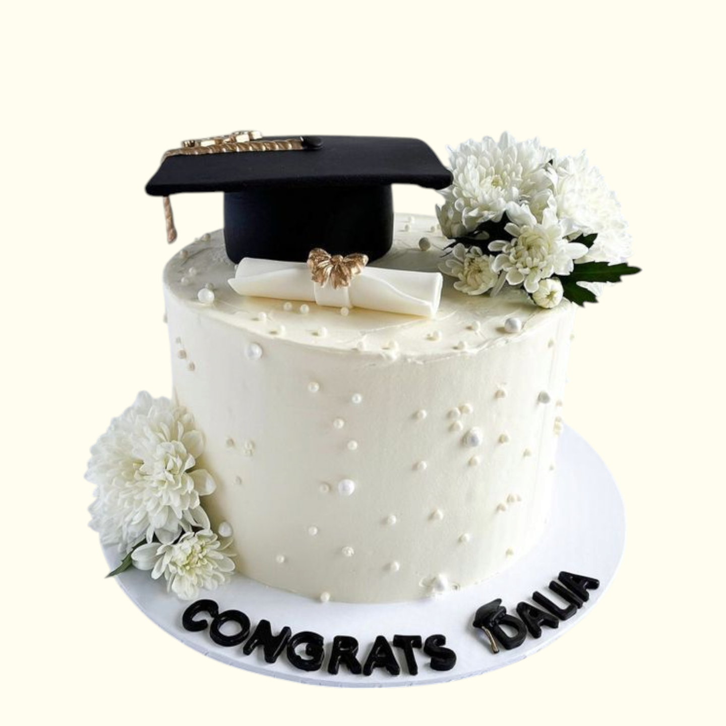 Celebrate graduation with the "Congrats Day" cake, a 1kg fresh vanilla delight adorned with elegant white flowers. Expertly crafted, this cake combines smooth vanilla flavor with delicate floral decoration, making it a perfect centerpiece for honoring academic achievements. Its fresh ingredients ensure a moist, flavorful experience that complements the joyous occasion beautifully.