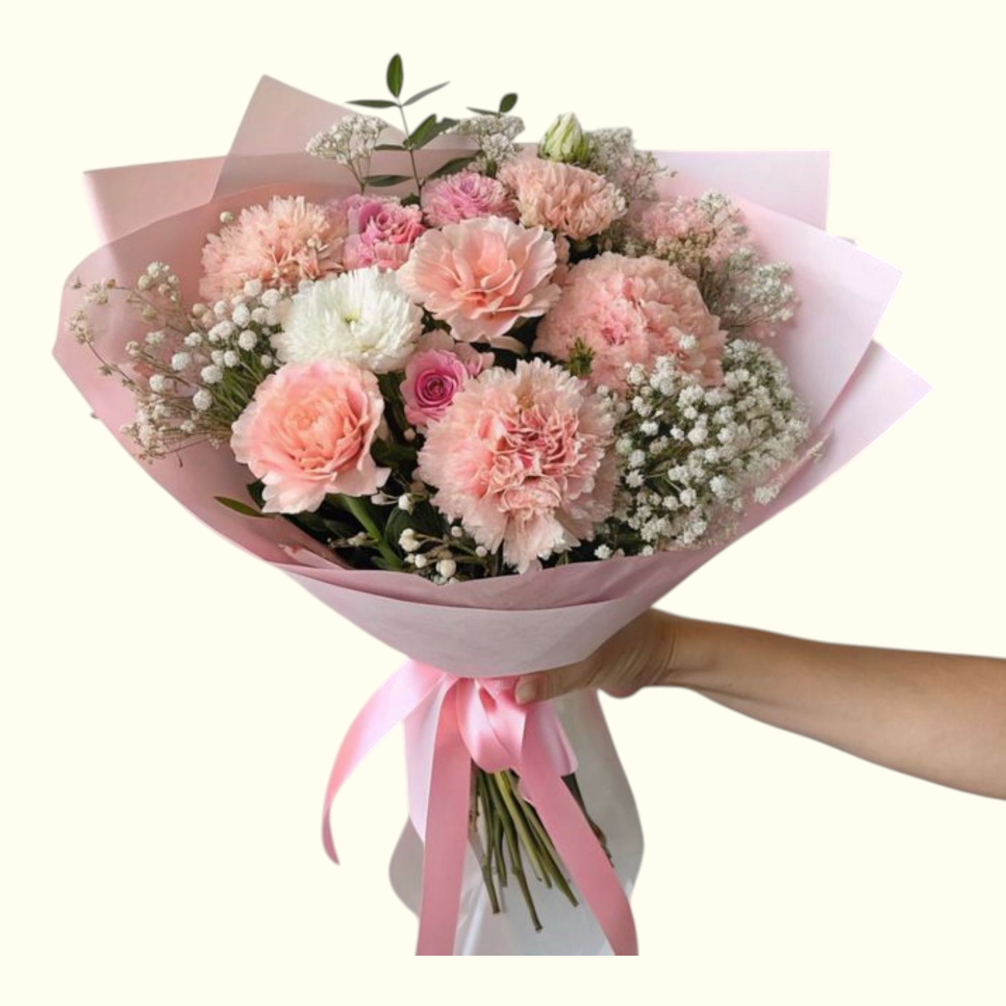 This elegant bouquet features 10 fresh pink carnations, 5 fresh pink roses, and 5 fresh white roses, complemented by delicate gypsophila and lush green leaves. Expertly arranged and wrapped in handcrafted pink paper, it offers a refined and harmonious blend of colors and textures, perfect for expressing admiration and grace.