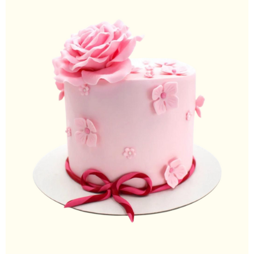 A beautifully crafted pink cake adorned with delicate flower patterns and finished with a soft satin-style bow at the bottom. Perfect for birthdays, baby showers, and elegant celebrations.