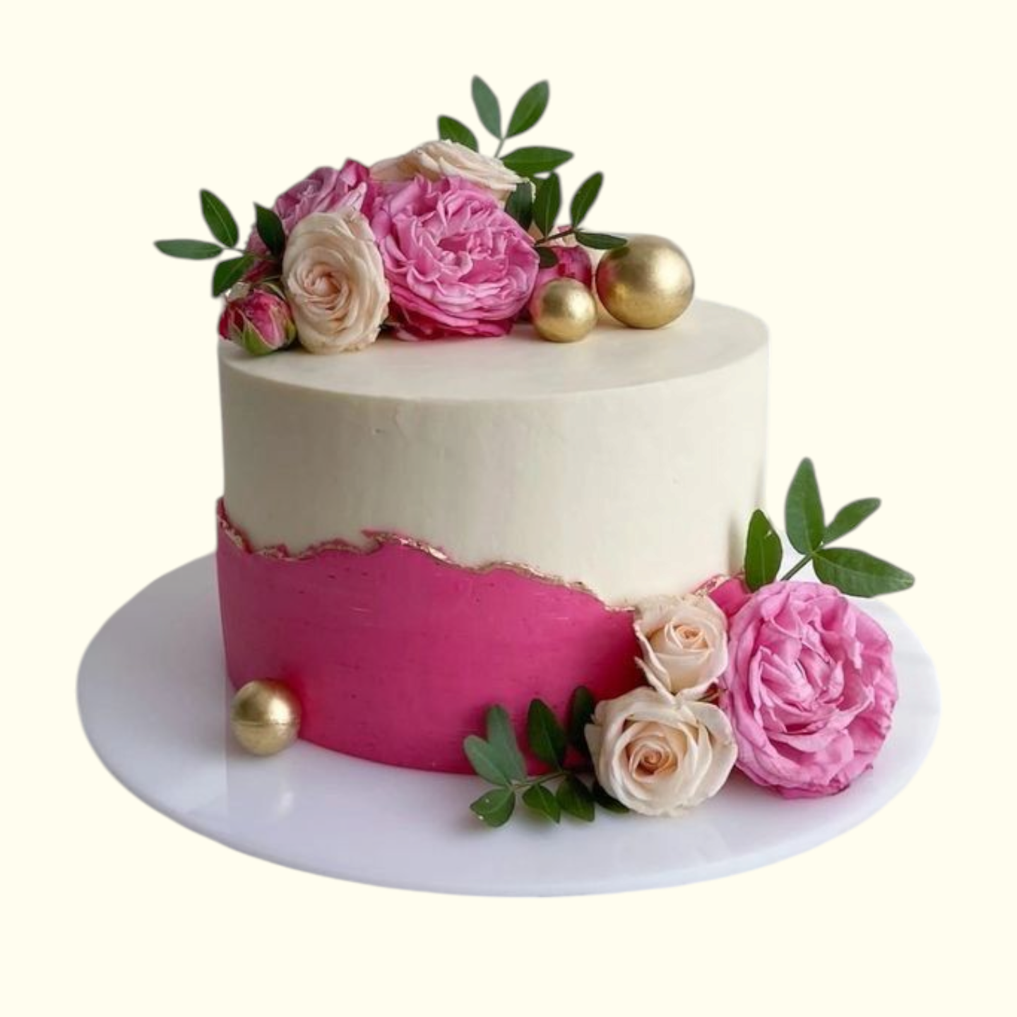 This 1kg vanilla cake showcases a sophisticated two-color design, enhanced by a delicate pink flower arrangement that adds elegance and charm. Adorned with lustrous golden balls, it creates a luxurious visual appeal while maintaining a classic, delicious flavor. Expertly crafted, this cake is an ideal choice for refined celebrations seeking both taste and style.