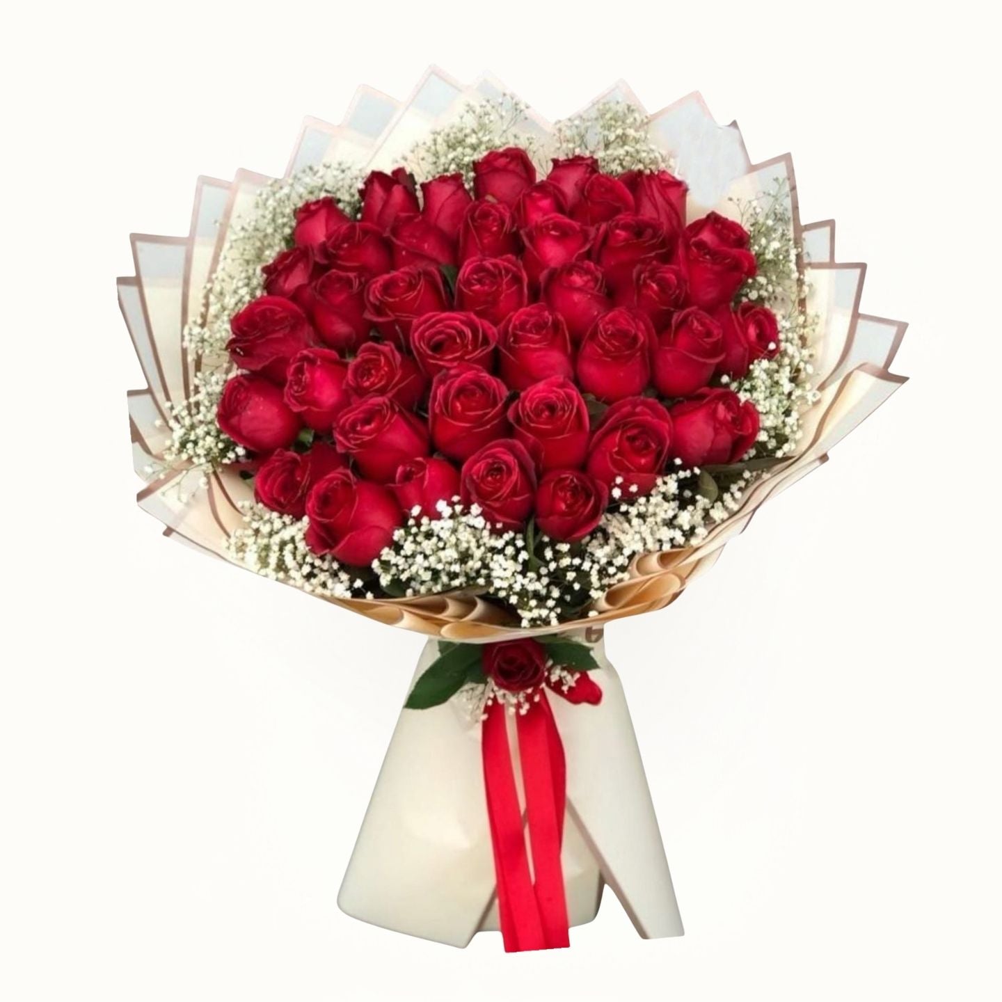 55pc of Fresh Red Roses ,Around of roses White Gypsophila 5steams,