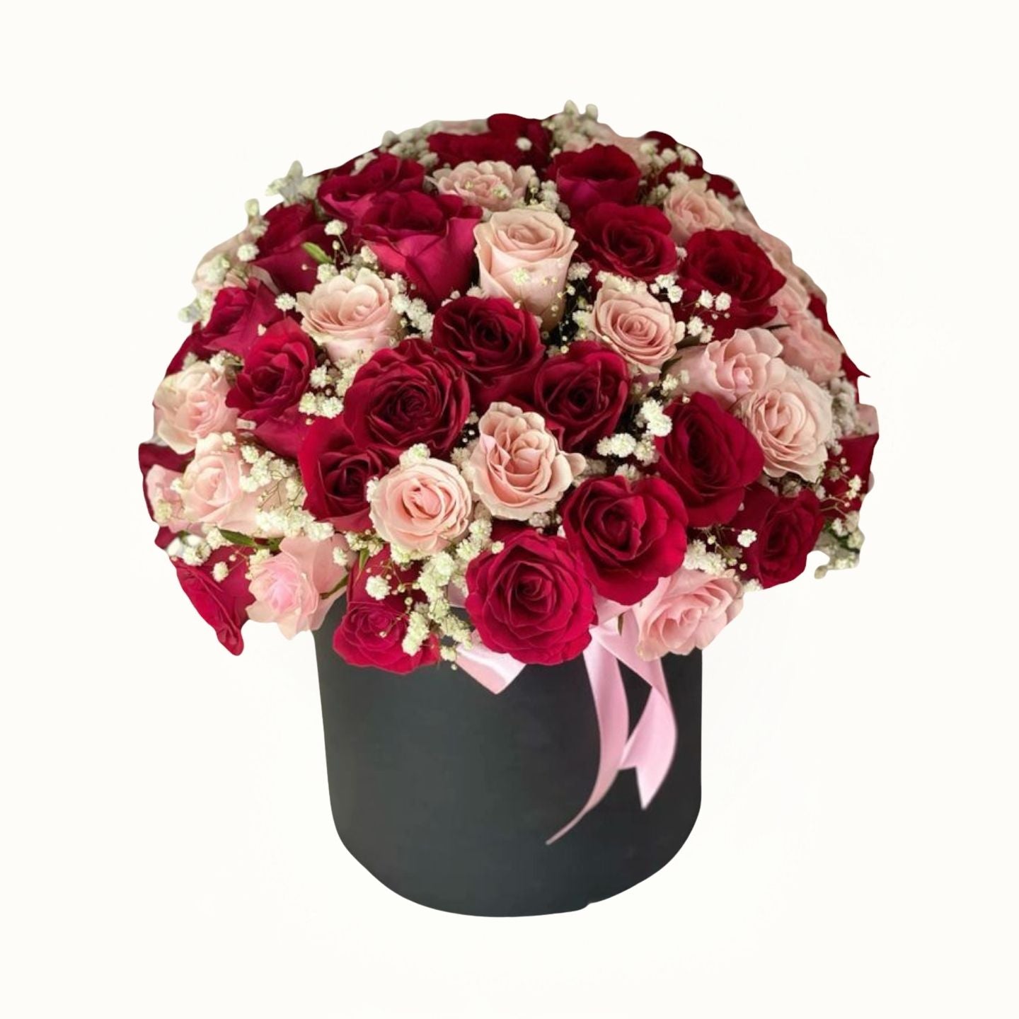 This elegant arrangement features 50 to 60 mixed red and pink roses, beautifully complemented by delicate gypsophila throughout. Presented in a sleek black box, it offers a sophisticated and timeless gift perfect for expressing heartfelt sentiments with expert floral artistry.