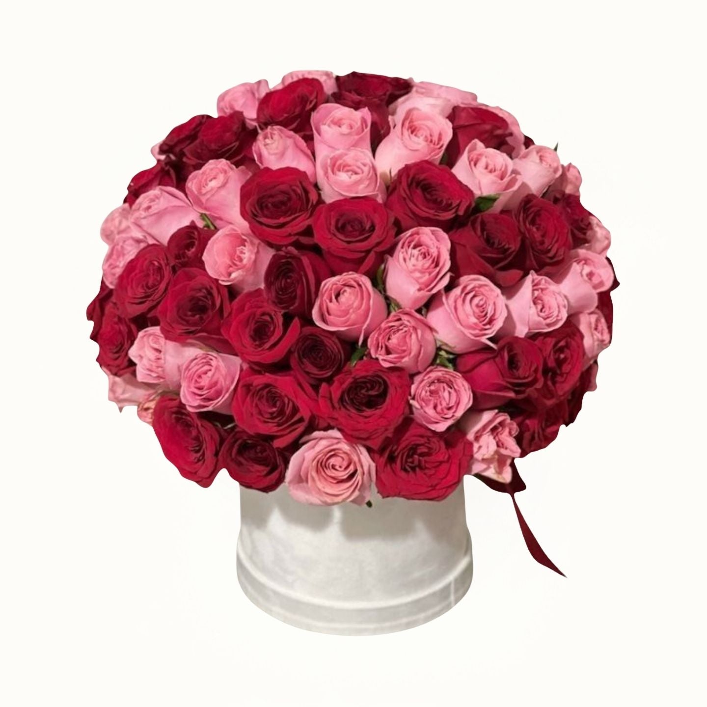 This elegant Ice-cream Box features 50 to 60 fresh red and pink roses arranged in a perfect round shape. Ideal for special occasions, the vibrant blooms are carefully selected to ensure lasting freshness and a stunning visual impact. Presented in a stylish box, this arrangement combines classic beauty with modern presentation, making it a sophisticated gift choice for expressing love and appreciation.