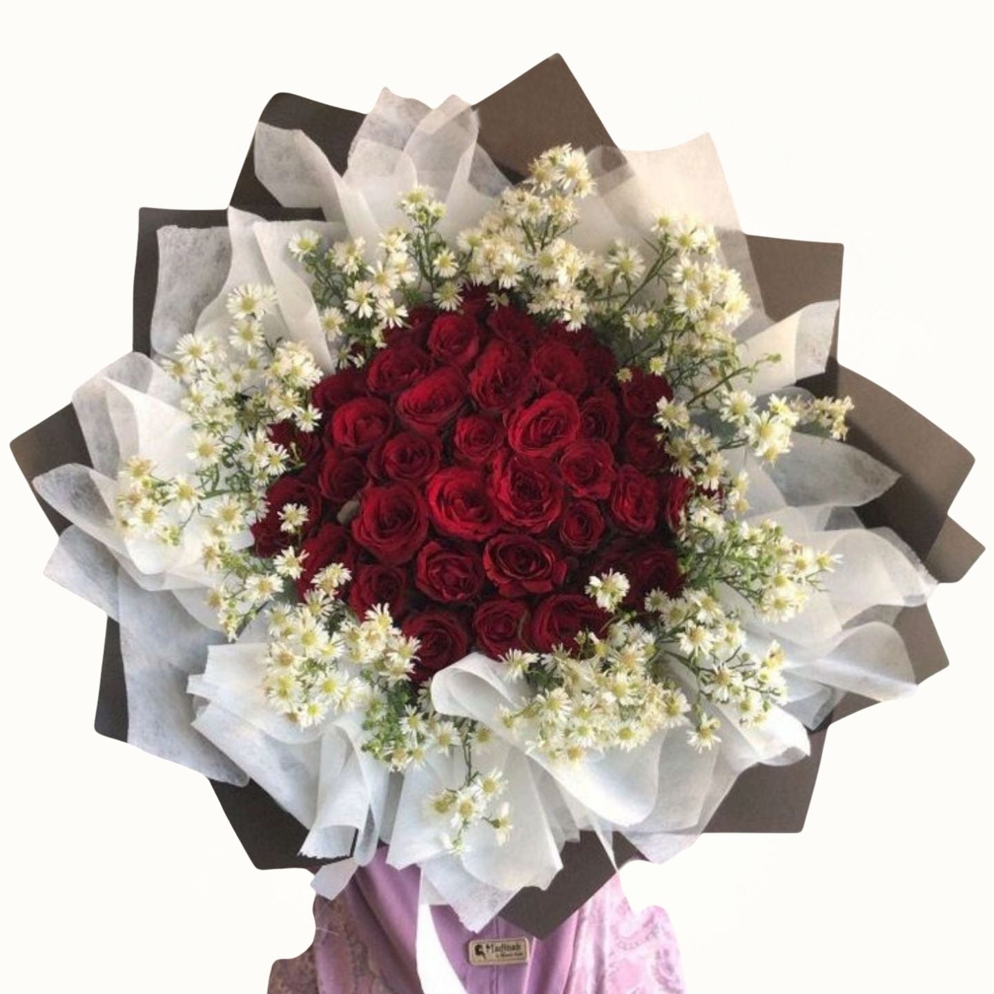 Inside Of Heart features a stunning bouquet of 30 fresh red roses, expertly arranged with delicate daisies to create a harmonious blend of colors and textures. The flowers are hand-wrapped in elegant white and black paper, adding a sophisticated touch to this romantic arrangement. Perfect for expressing deep affection with a refined presentation.
