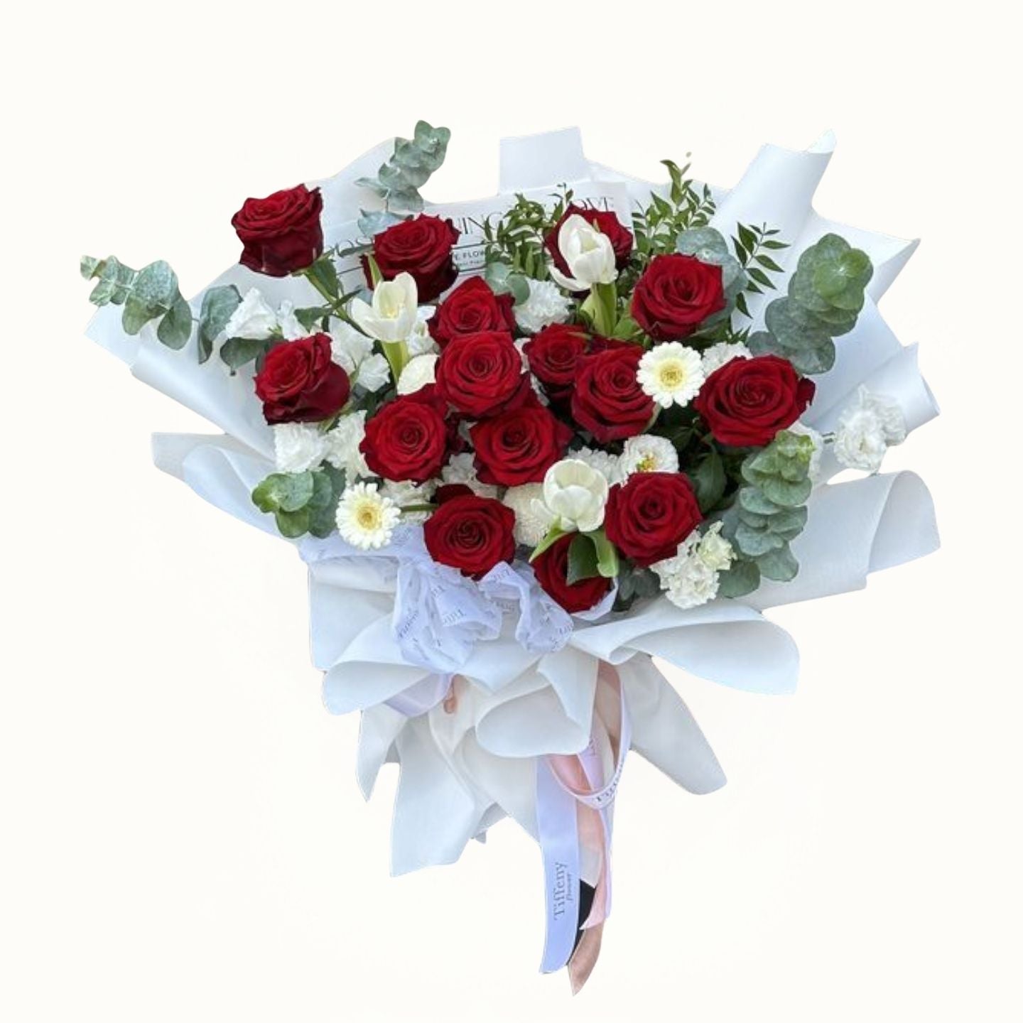 This expertly crafted bouquet features 15 vibrant red roses complemented by 5 stems of delicate white lisianthus and 5 pristine white carnations. Accented with fresh green leaves and 5 sprigs of eucalyptus, it offers a harmonious blend of colors and textures. Wrapped in elegant white paper, this arrangement exudes sophistication and is perfect for expressing heartfelt sentiments with timeless beauty.