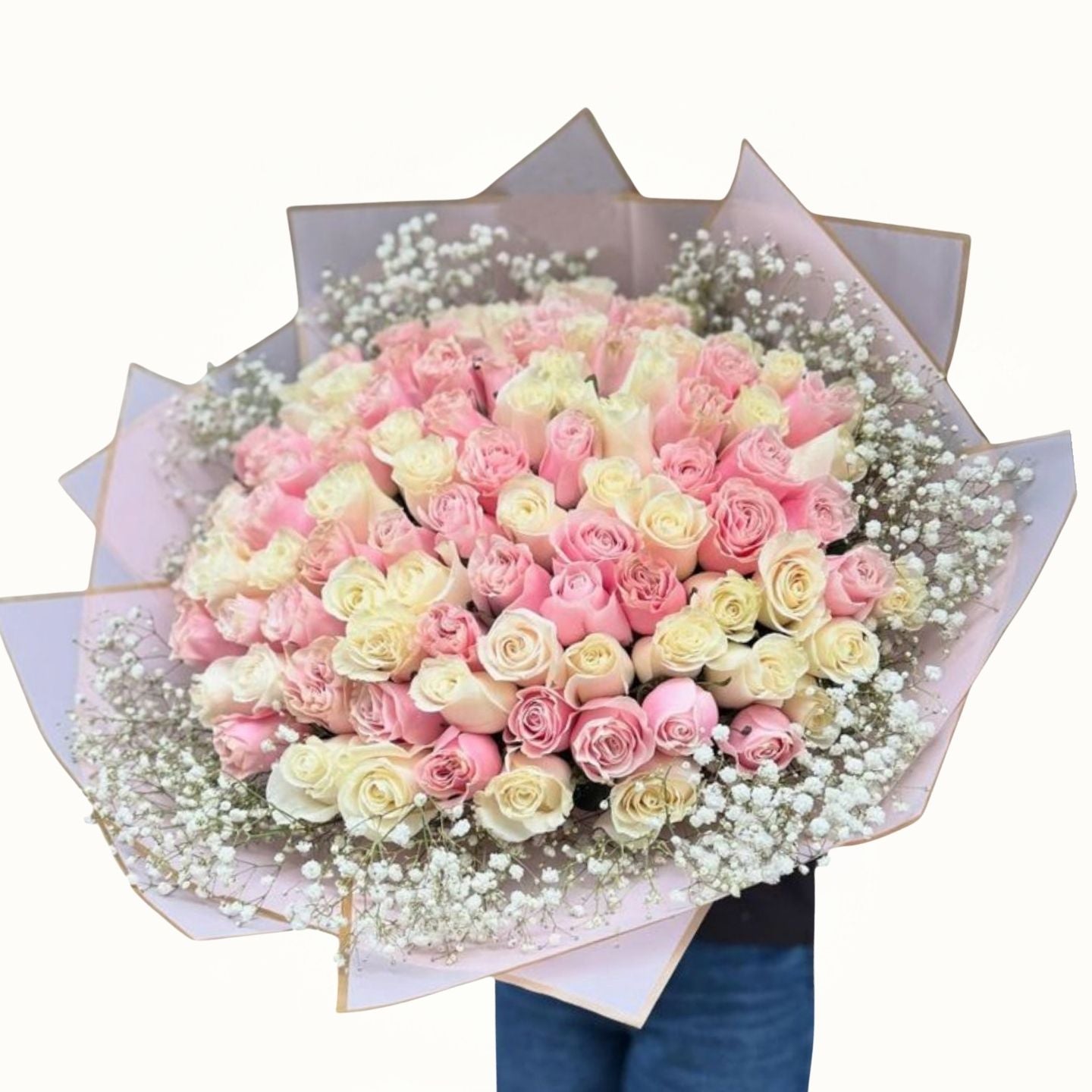 The "Light Of Life" bouquet showcases 55 fresh pink and white flowers, artfully arranged and encircled by delicate white gypsophila. Handcrafted with care, it is elegantly wrapped in soft pink paper, creating a sophisticated and timeless floral gift.