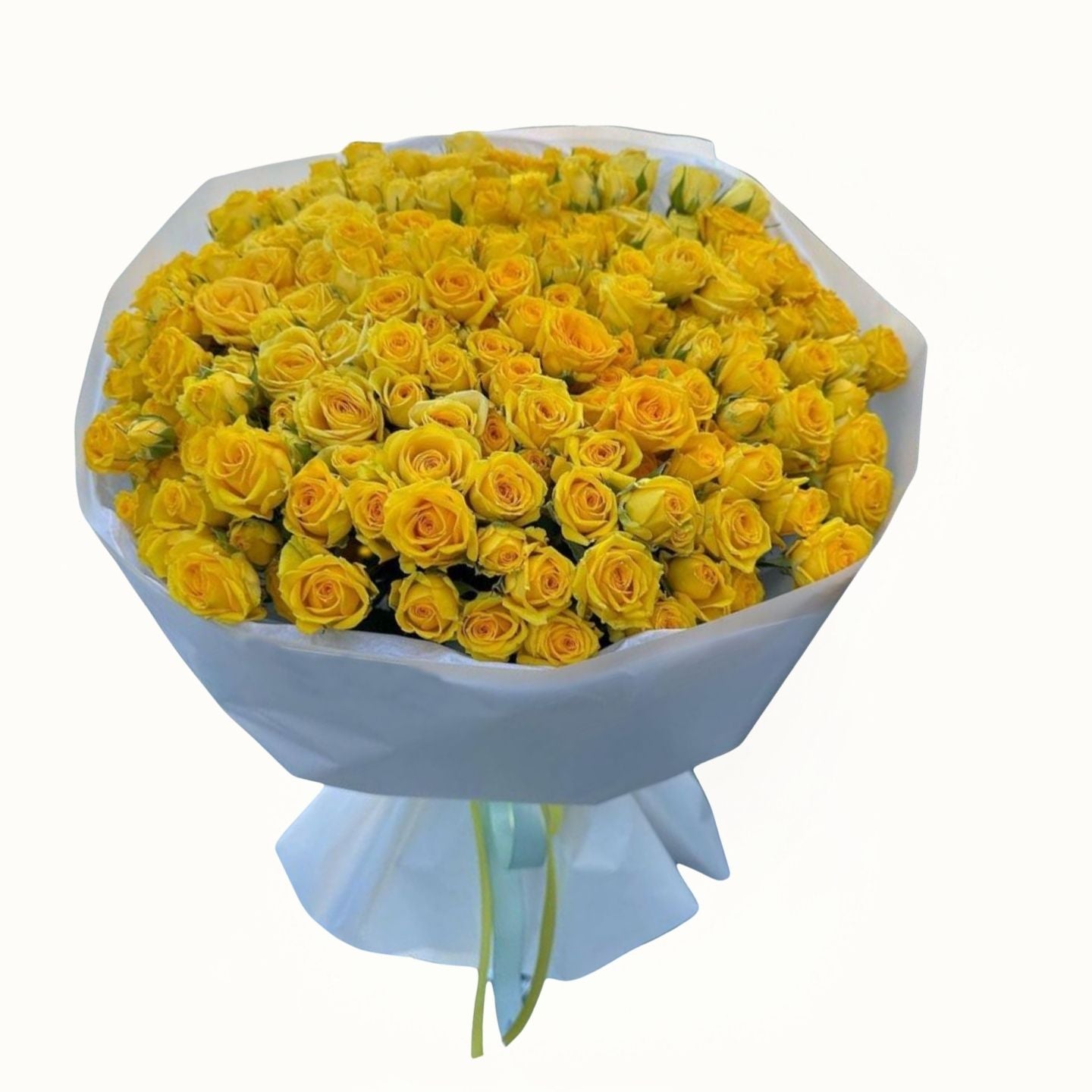 This exquisite arrangement features 55 fresh baby yellow roses, expertly hand-crafted with delicate white wrapping. The vibrant yellow blooms symbolize friendship and joy, making it a perfect gift for special occasions or to brighten any space with elegance and warmth. Each rose is carefully selected to ensure freshness and longevity, showcasing refined craftsmanship in every detail.