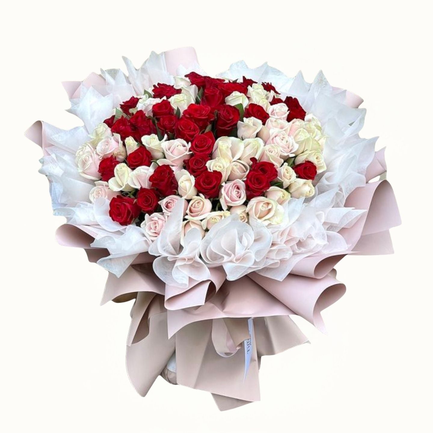 Experience the elegance of 100 fresh roses in a stunning blend of red, white, and pink hues. Expertly hand-crafted with delicate white and pink wrapping, this bouquet offers a harmonious color combination that conveys love and sophistication. Perfect for expressing deep emotions with a refined touch.