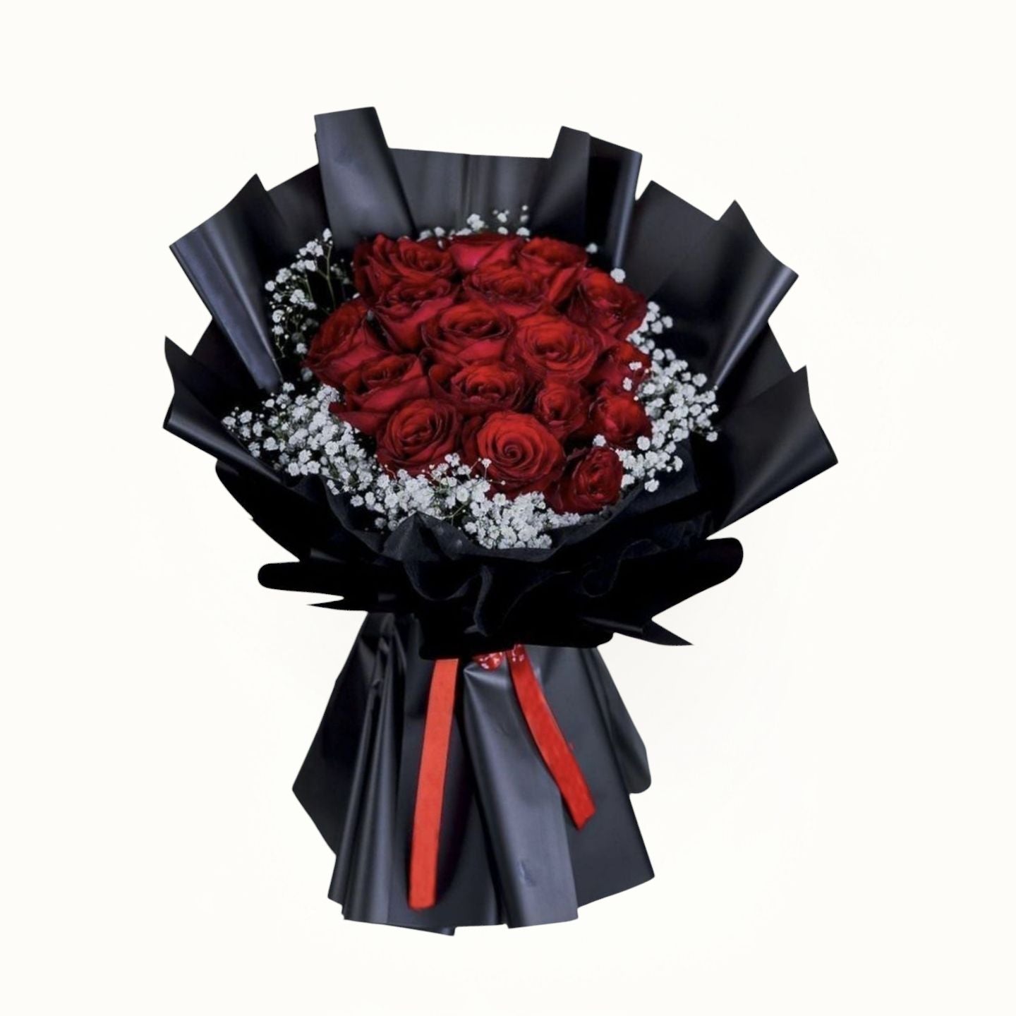 Celebrate your affection with this expertly arranged bouquet featuring 20 fresh red roses complemented by delicate white gypsophila. Each stem is carefully hand-crafted and wrapped in elegant black paper, creating a striking contrast that enhances the vibrant blooms. Perfect for expressing deep love with a sophisticated touch.