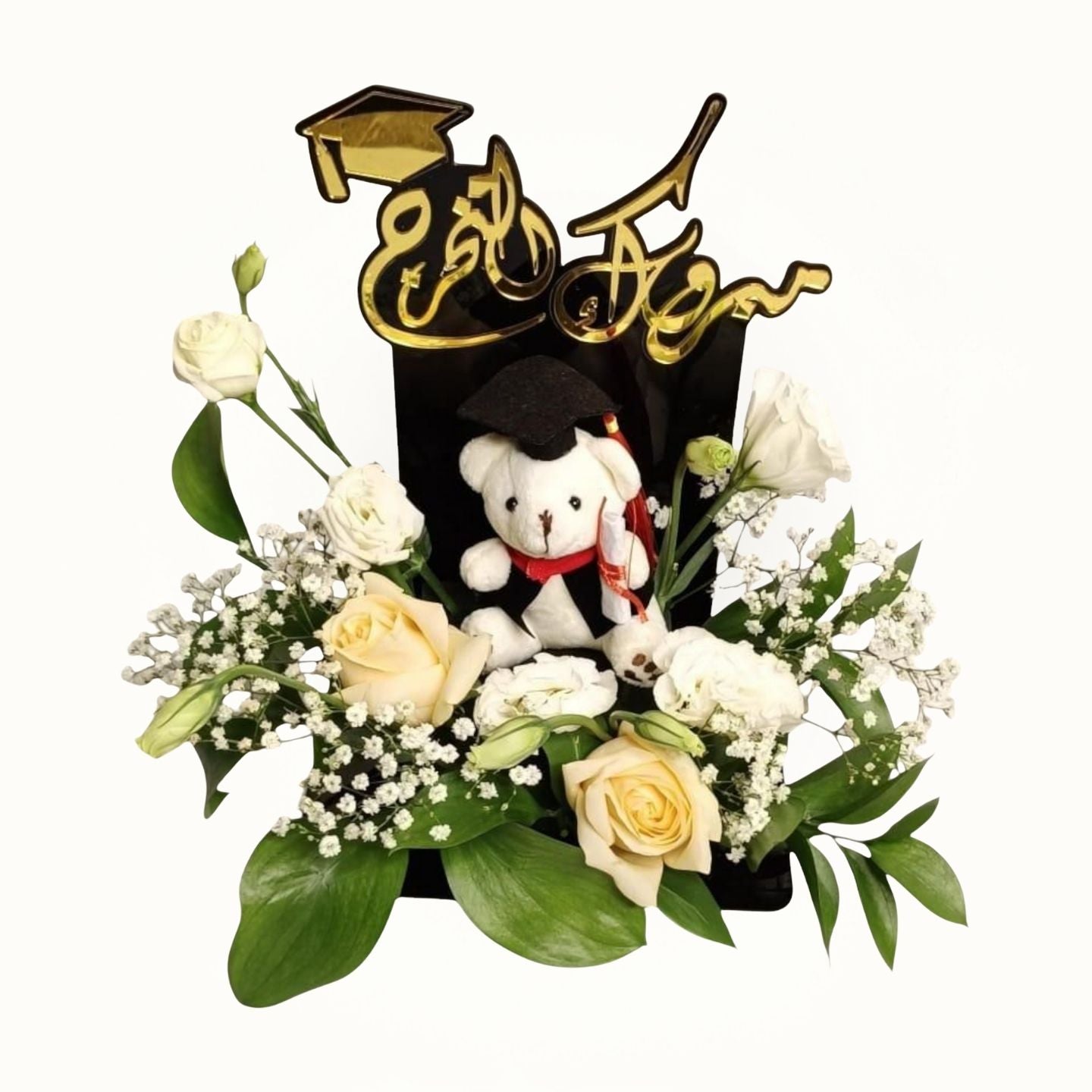 New Collection of Graduation , With Black Acrylic Stand ,white Lisanthos 3pc, Beige Color Roses 5pc, white carnation 3pc, and some Gypsophila and green Leaves , Look Amazing For Graduate Gift .