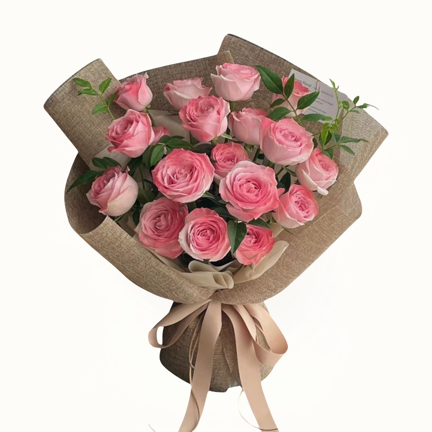 This Madame Pink bouquet features fresh pink roses 20pc ,complemented by lush green leaves, expertly arranged to highlight their natural beauty. Wrapped by hand in elegant brown paper, this bouquet combines classic charm with a rustic touch, making it a refined choice for any occasion.