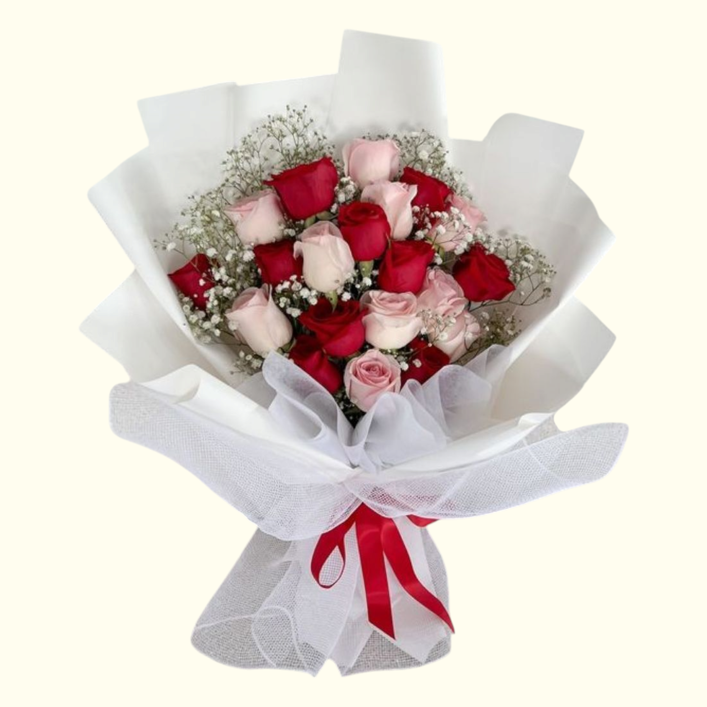 This elegant bouquet features 20 fresh roses, including 10 red and 10 pink blooms, complemented by delicate gypsophila. Expertly arranged and wrapped in handcrafted white paper, it offers a refined presentation perfect for expressing heartfelt sentiments with sophistication.
