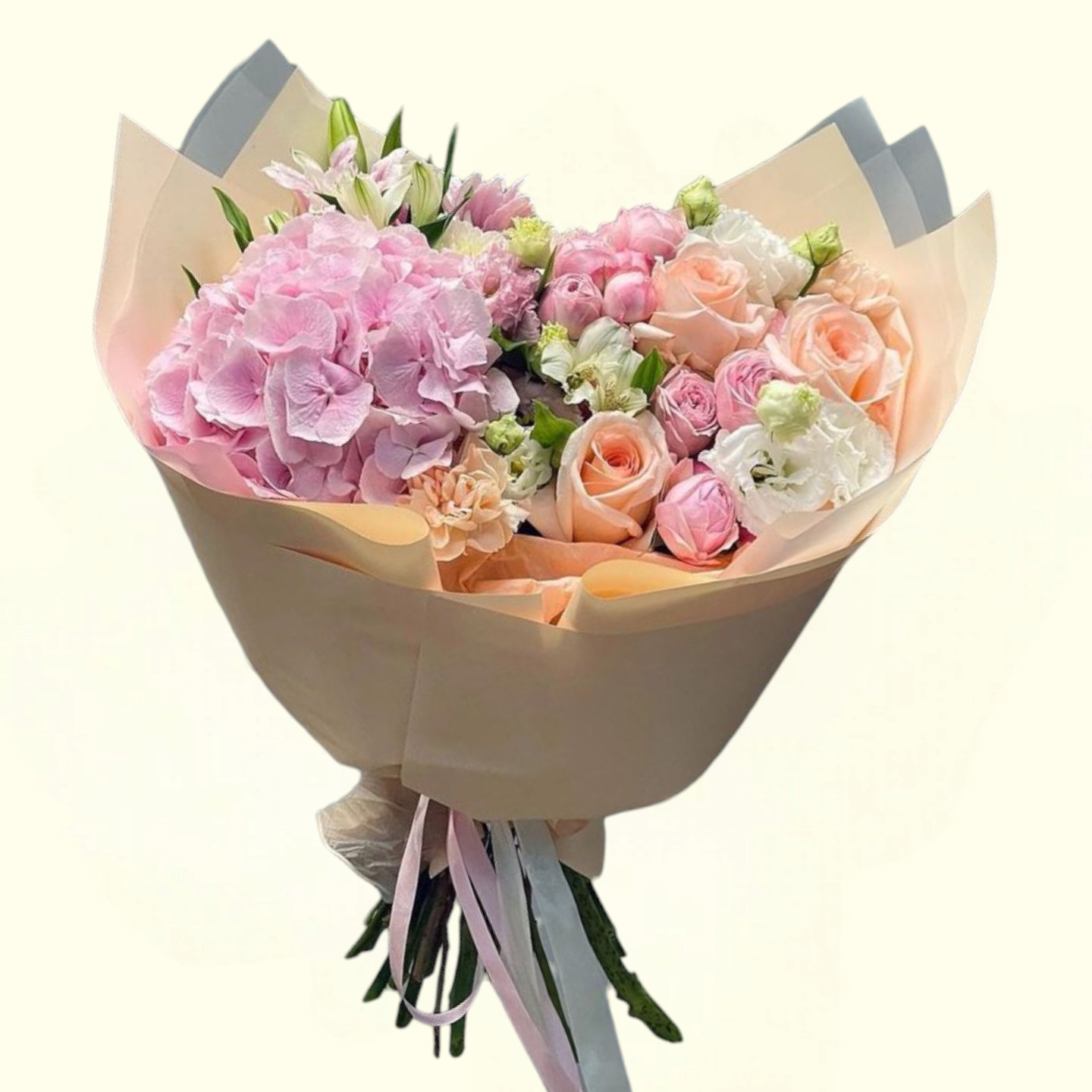 This expertly arranged Mixed Peony bouquet features delicate pink hydrangeas, lush pink peonies, elegant white lisianthus, pristine white lilies, and soft beige roses. Each bloom is carefully selected and wrapped in five pieces of handcrafted cream-colored paper, creating a sophisticated presentation perfect for any occasion. The harmonious blend of colors and textures offers a refined floral experience that conveys grace and beauty effortlessly.
