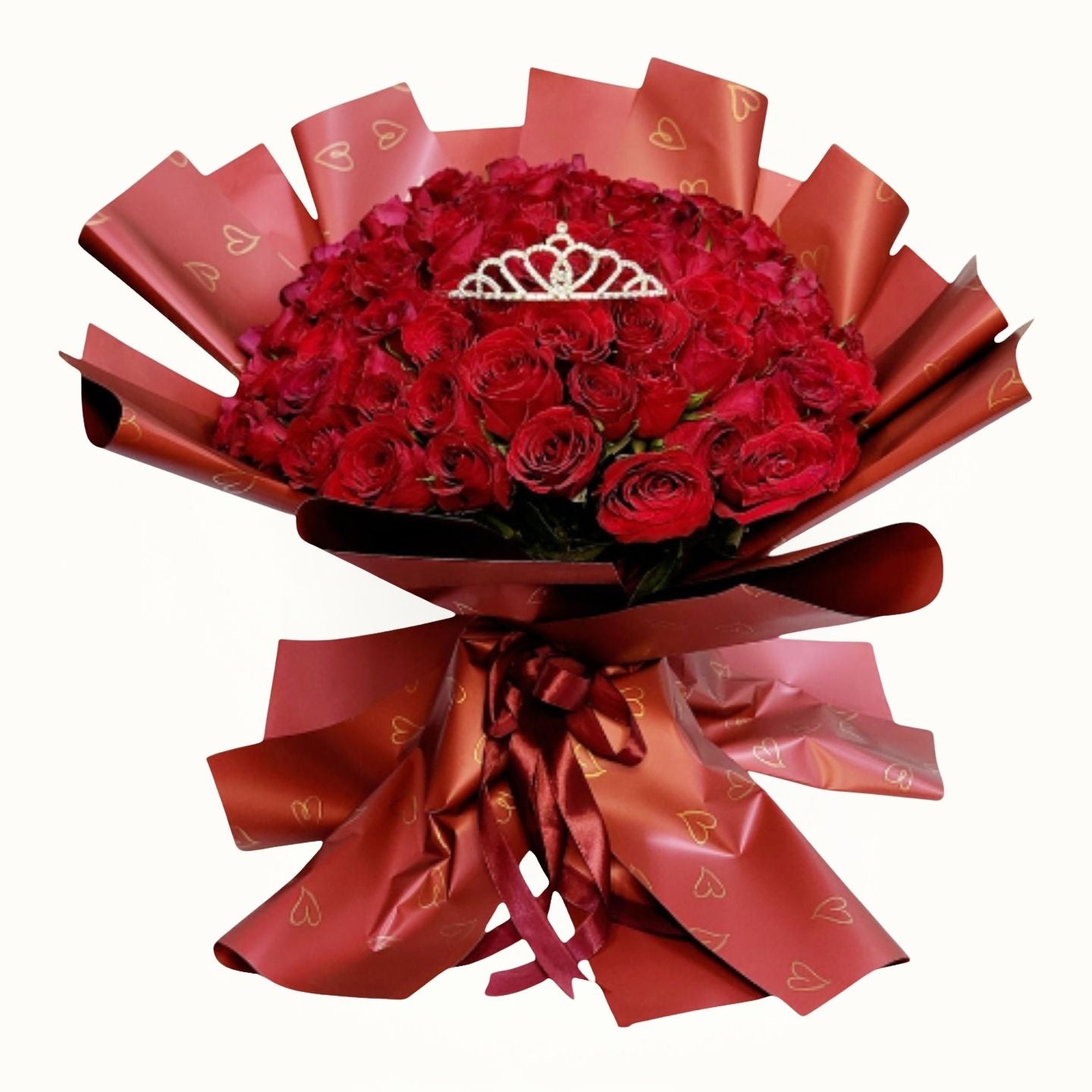 Celebrate elegance with "My Princes," a stunning bouquet of 55 fresh red roses. Each rose is carefully selected for its vibrant bloom and expertly arranged with a handcrafted red wrapping, topped with a delicate white crown. This arrangement combines classic beauty with refined craftsmanship, perfect for making a memorable impression.