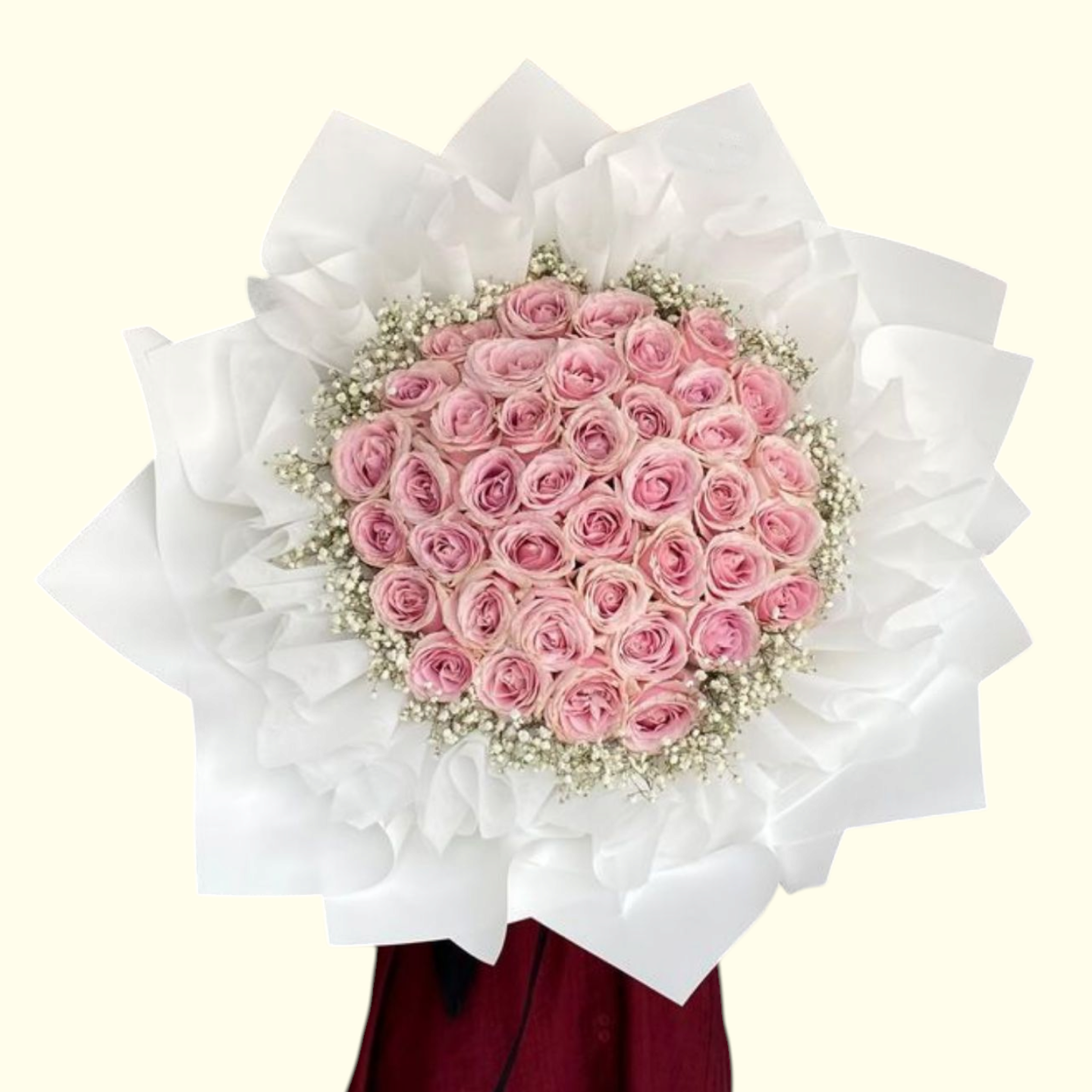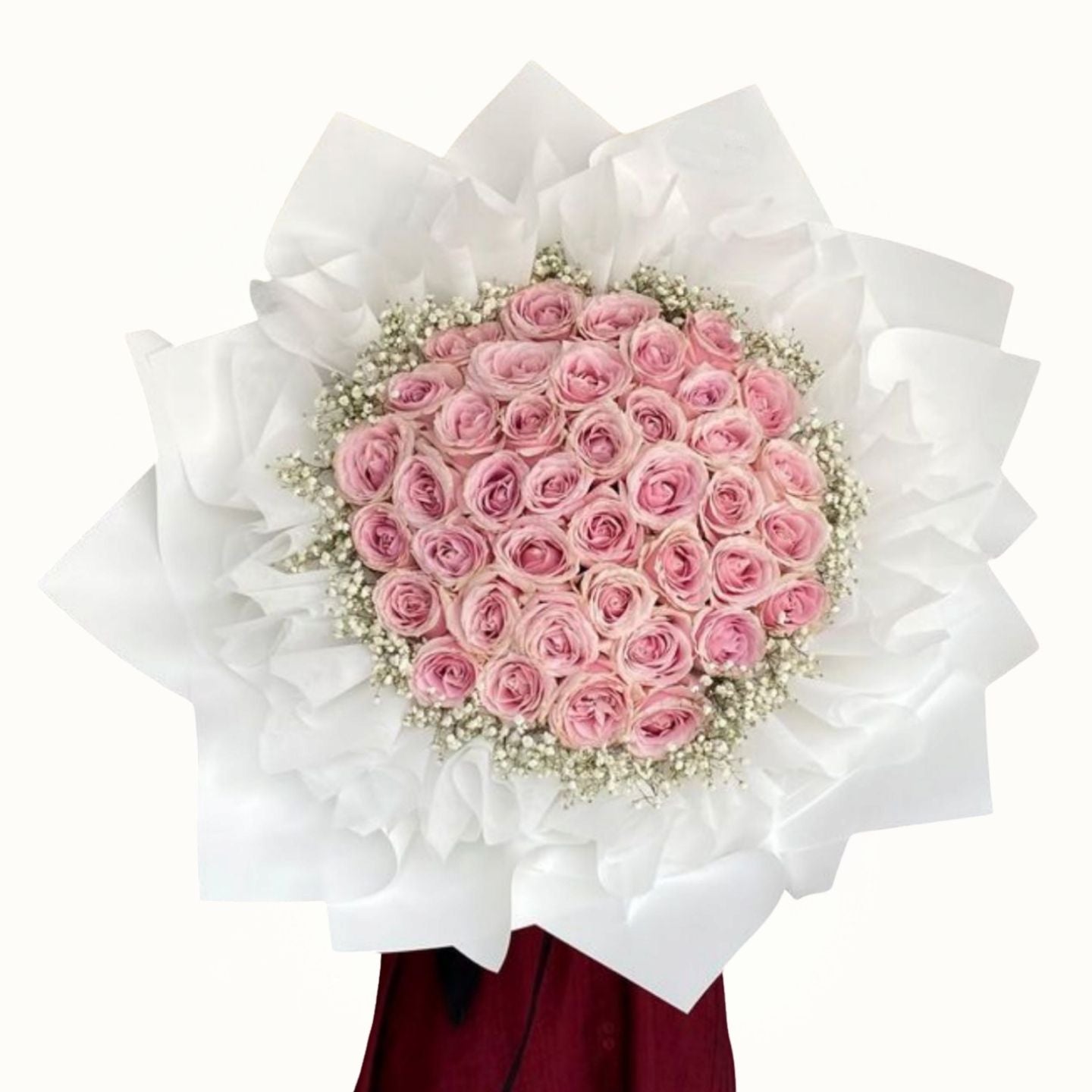 Experience elegance with Pink Bliss, featuring 55 fresh pink roses beautifully accented by delicate white gypsophila. Expertly hand-crafted with pristine white wrapping, this bouquet offers a refined and timeless expression of affection, perfect for special occasions or to brighten any space with sophisticated charm.