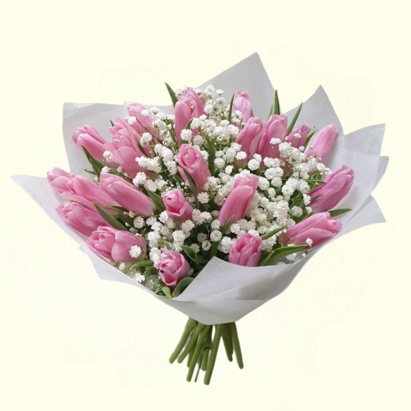 This elegant bouquet features 30 fresh pink tulips paired with five stems of delicate white gypsophila, expertly arranged to highlight their natural beauty. Wrapped by hand in pristine white paper, this floral arrangement offers a refined and graceful presentation, perfect for expressing admiration or celebrating special moments with sophistication.