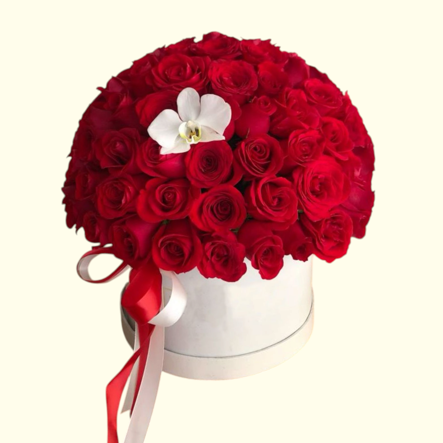 Presenting "Pretty Love," a sophisticated floral arrangement featuring 50 to 60 fresh red roses elegantly arranged in a box, topped with a single pristine white orchid and finished with a delicate ribbon. This combination offers a striking contrast that symbolizes deep passion and pure elegance, perfect for expressing heartfelt emotions with expert finesse.