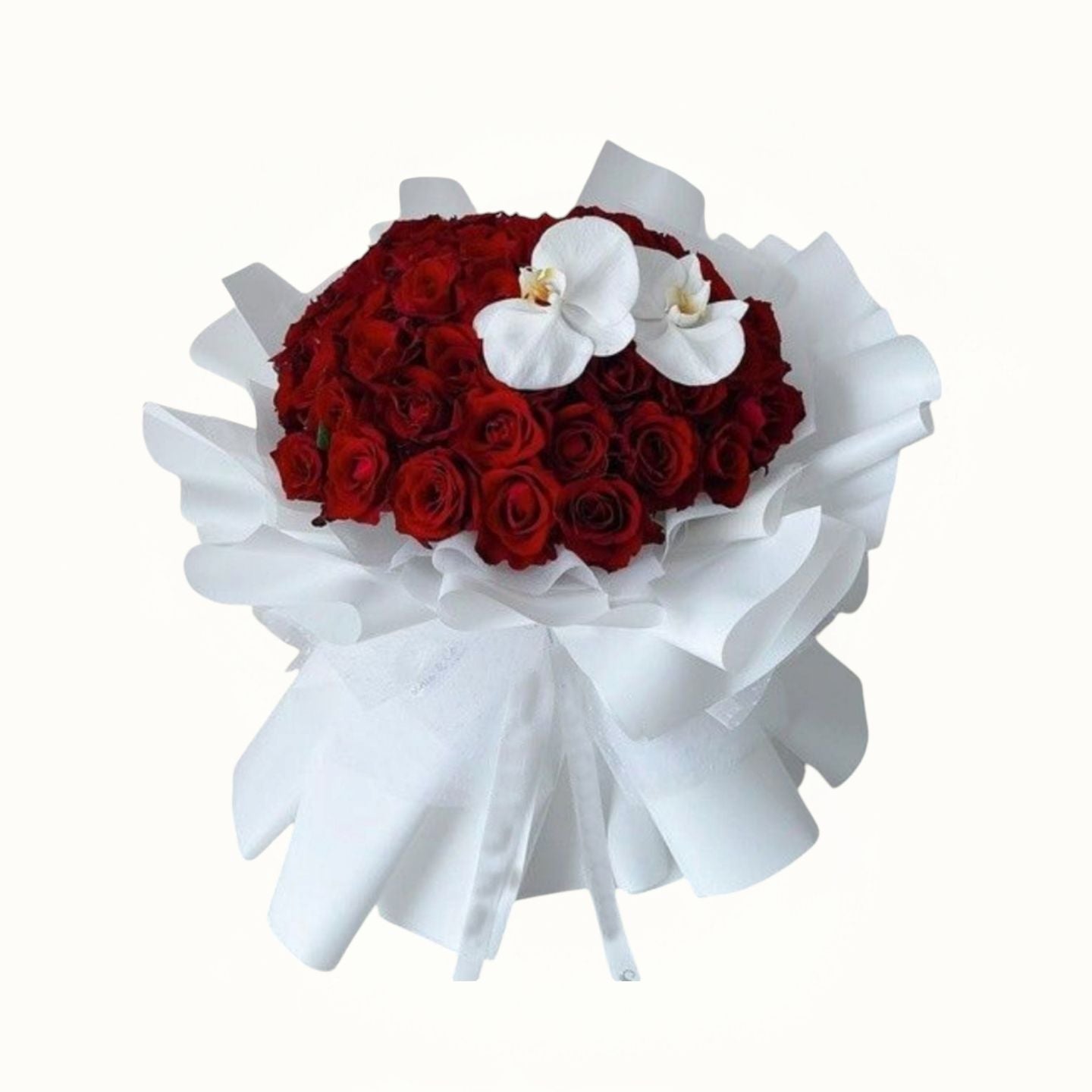 This elegant bouquet features 50 fresh red roses, crowned with two pristine white orchids for a striking contrast. Expertly hand-crafted with delicate white wrapping, it offers a refined presentation perfect for expressing deep admiration and love. Ideal for special occasions or to make a lasting impression.