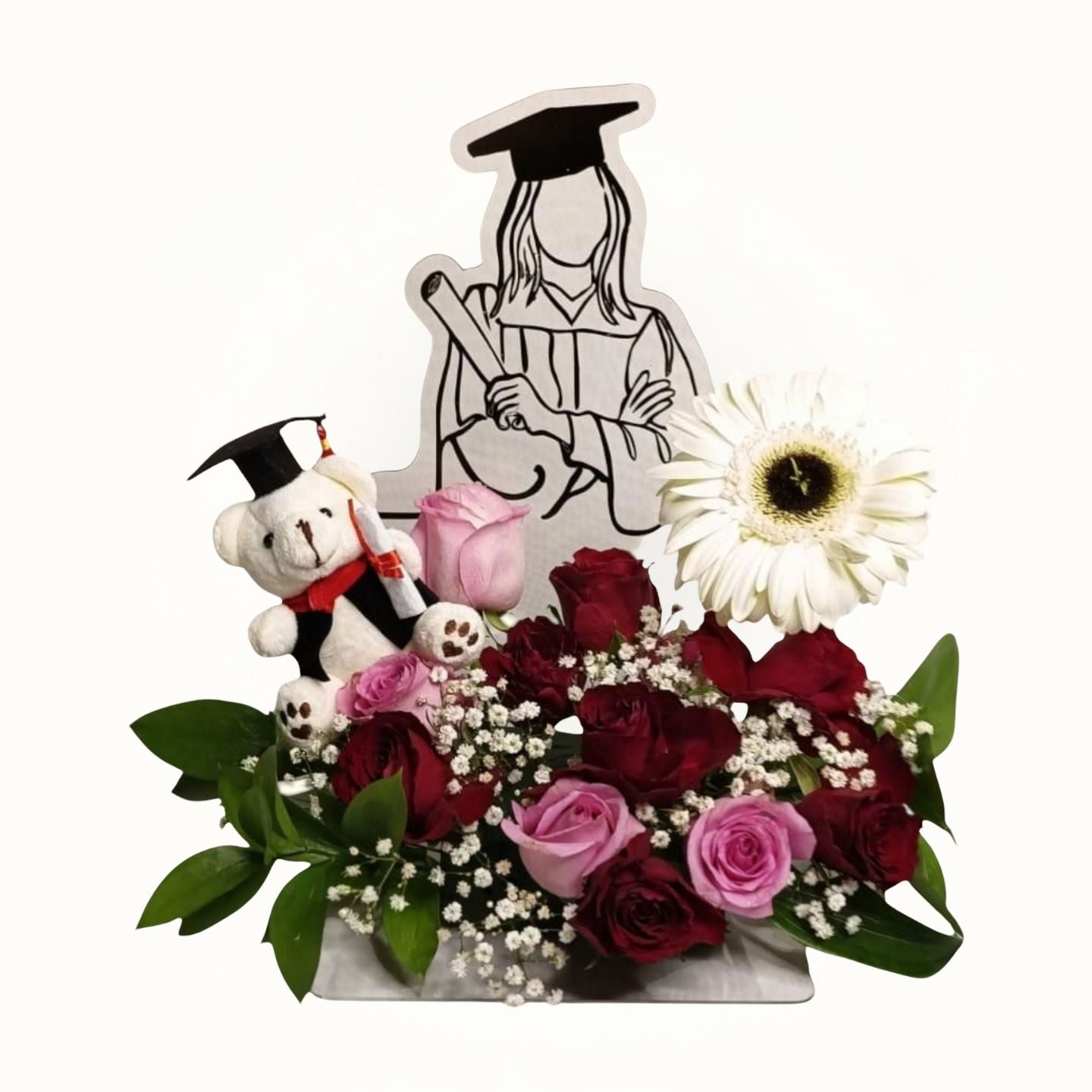 Mixed Flower of Red and Pink Roses 10pc, White Gypsophila 3pc Steams with Green Leaves, on the Acrylic Stand for Lady , with 1pc Cute Teddy, Best Gifts For graduation Season ,..Look Amazing Arrangement.