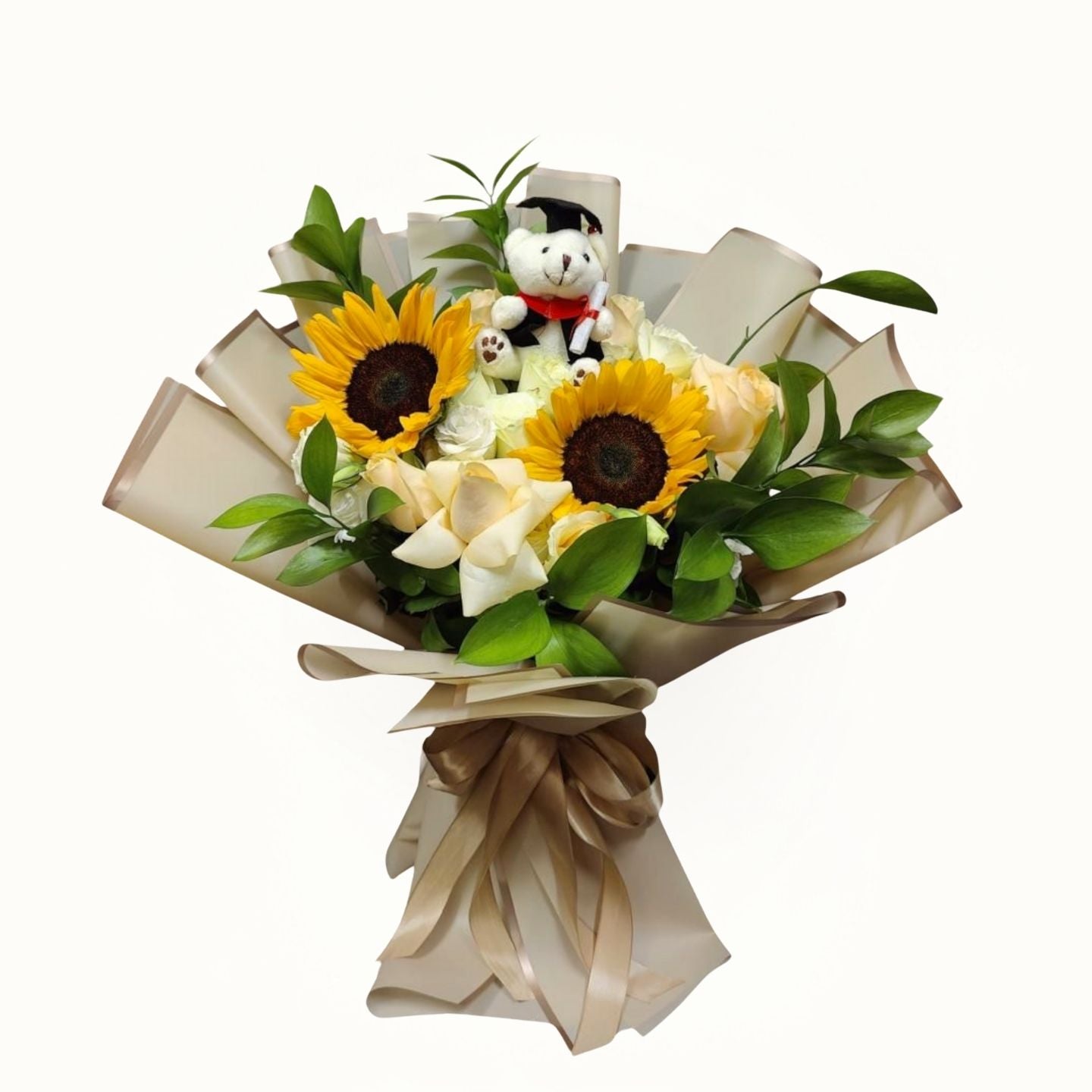 The "Proud of You" handcrafted bouquet combines 10 pristine white roses and 5 soft beige roses with delicate ruckuses, creating an elegant and sophisticated arrangement perfect for graduation celebrations. Accompanied by a charming graduate teddy bear, this bouquet offers a thoughtful and refined way to honor academic success and convey heartfelt congratulations.