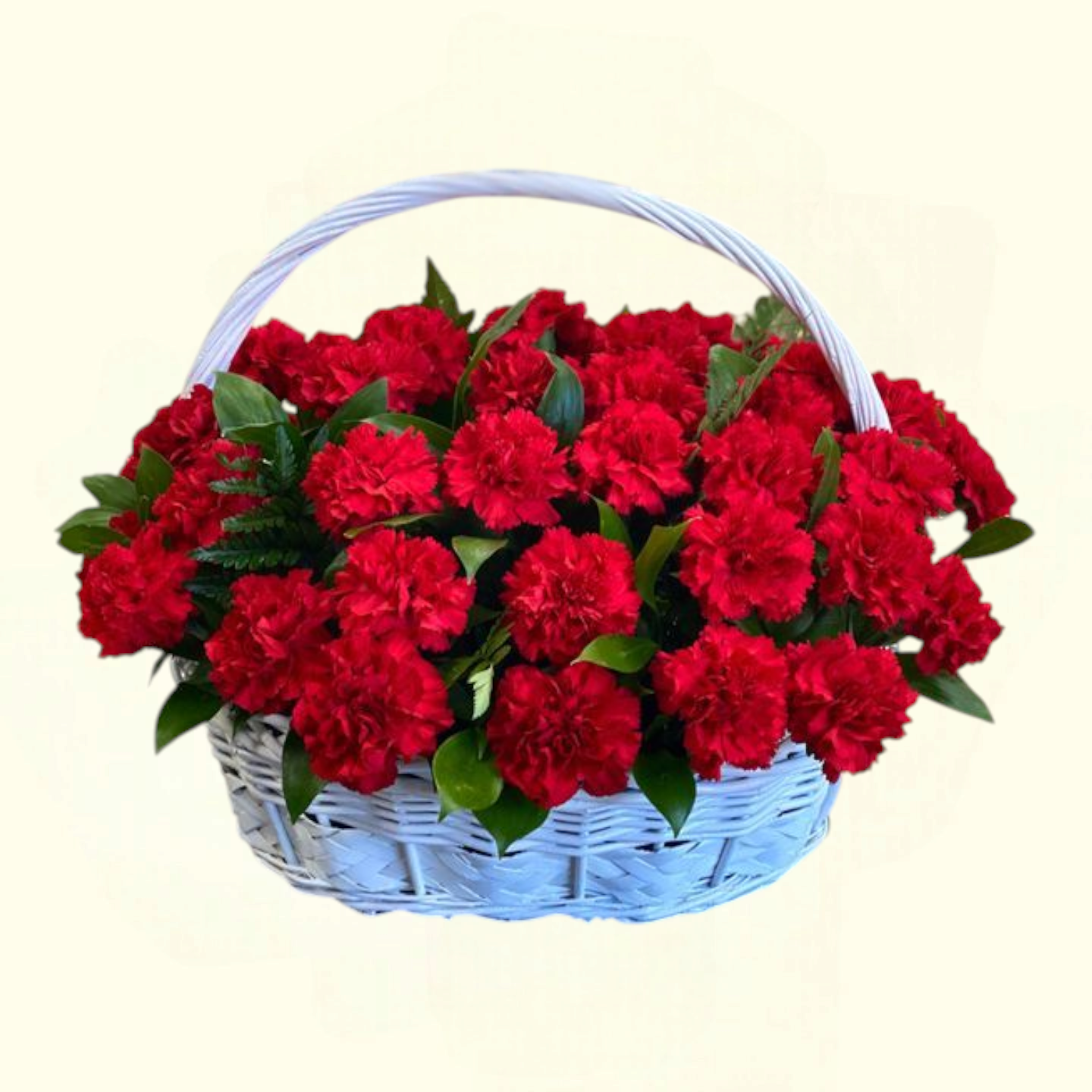 This elegant basket arrangement features 50 fresh red carnations complemented by lush green leaves. Expertly assembled to highlight the rich color and texture of the blooms, it offers a sophisticated and vibrant display. Ideal for conveying heartfelt emotions or enhancing any setting with natural beauty, this arrangement combines freshness and style in one thoughtful gift.
