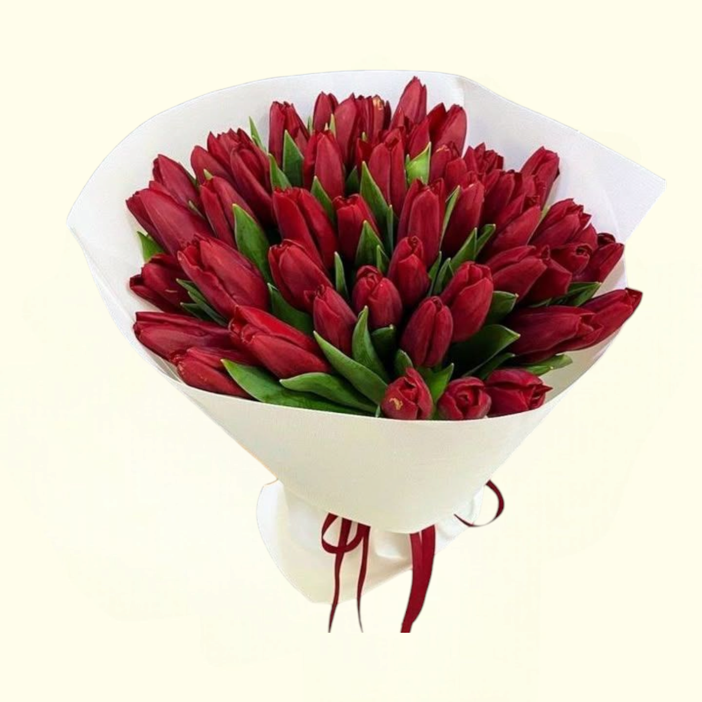 Celebrate elegance with this bouquet of 30 fresh red tulips, expertly hand-wrapped in delicate white paper. Perfect for conveying heartfelt emotions, these vibrant blooms bring a timeless charm to any occasion. The meticulous wrapping enhances their natural beauty, making this arrangement a refined gift or centerpiece.