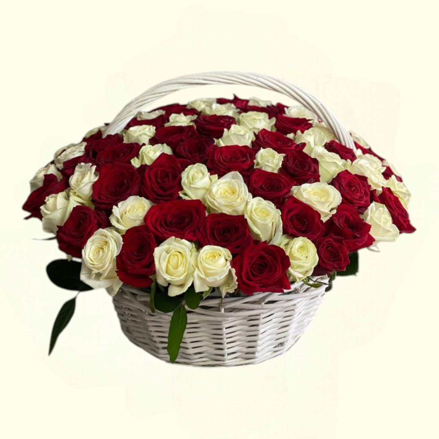 This elegant basket features 100 fresh red and white roses, expertly arranged to create a stunning contrast of colors. Perfect for special occasions or as a sophisticated gift, the combination of vibrant red and pure white roses symbolizes love and purity. Each rose is carefully selected to ensure freshness and longevity, making this arrangement a timeless expression of beauty and grace.