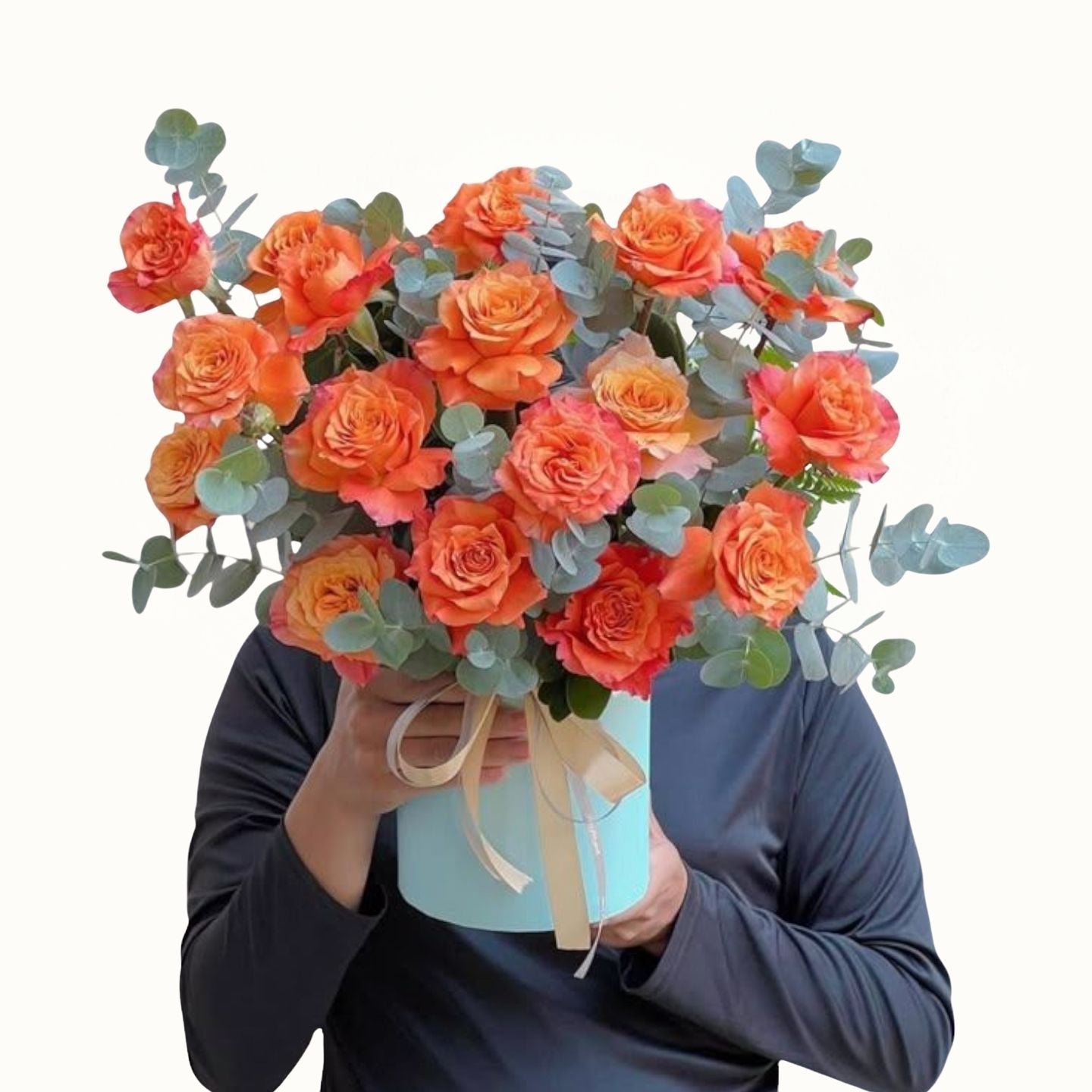 Celebrate the vibrant beauty of summer with this elegant arrangement featuring 20 fresh orange roses paired with 20 sprigs of lush green eucalyptus. Presented in a stylish round box, this bouquet combines vivid color and refreshing greenery to create a sophisticated and fragrant display perfect for any occasion.