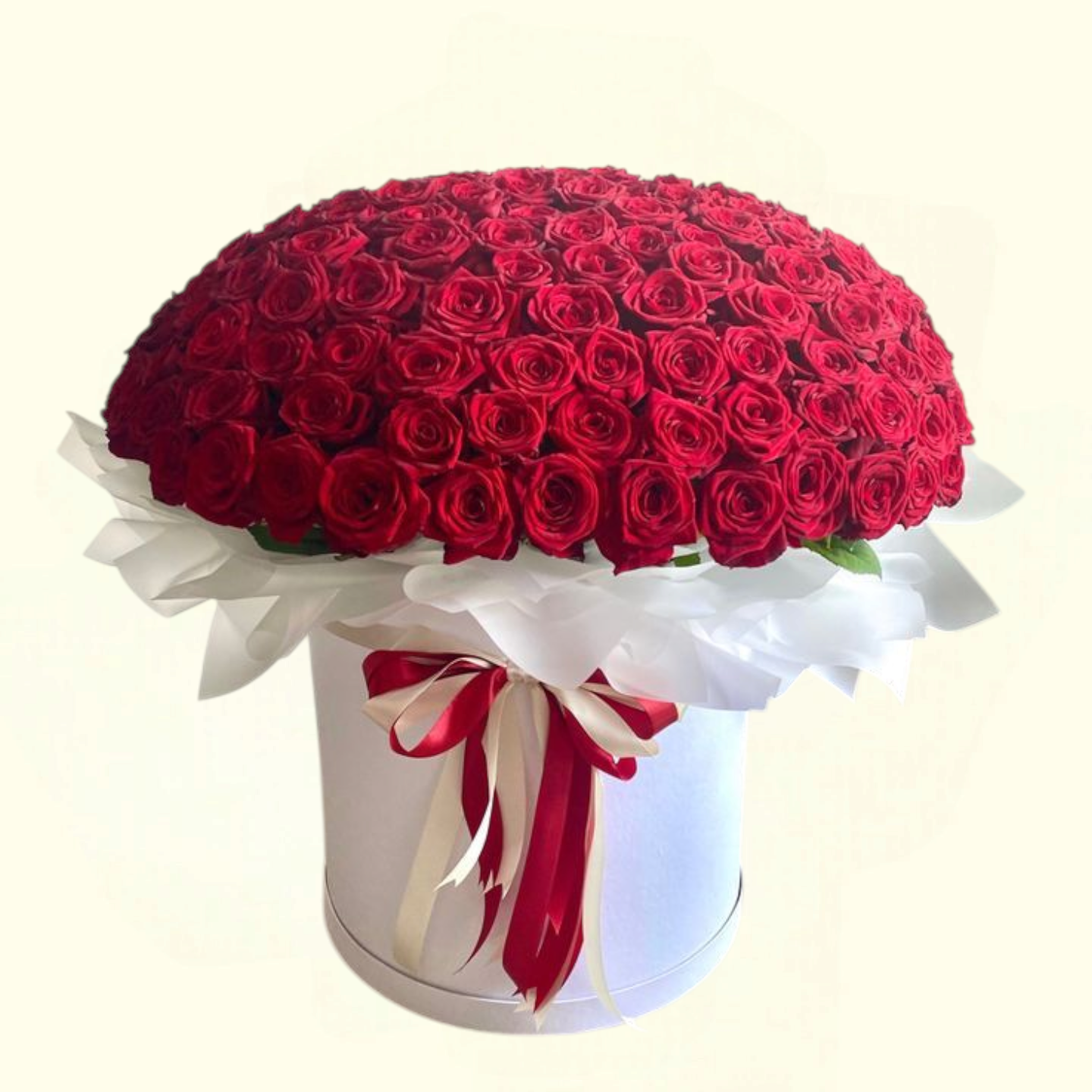 Presenting a sophisticated arrangement of 100 fresh red roses artfully arranged in an umbrella shape within a sleek white box. Each bloom is carefully wrapped with a delicate white covering, enhancing the vibrant red petals and creating a striking contrast. This elegant floral design is perfect for making a memorable impression at any special occasion.