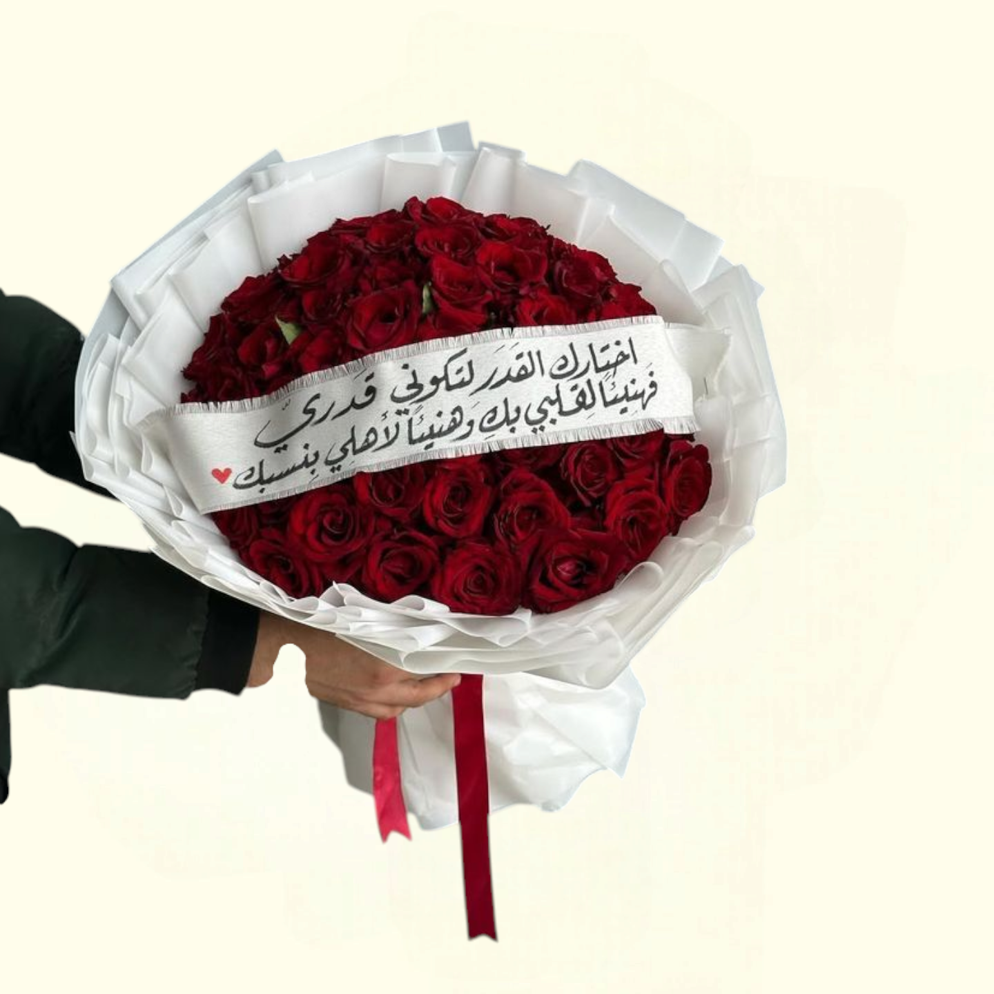 Celebrate a heartfelt reunion with 50 fresh red roses, expertly arranged and wrapped in elegant white paper. Each bouquet includes a personalized handwritten message on top, adding a thoughtful touch to your warm welcome. Perfect for expressing sincere emotions with timeless beauty.