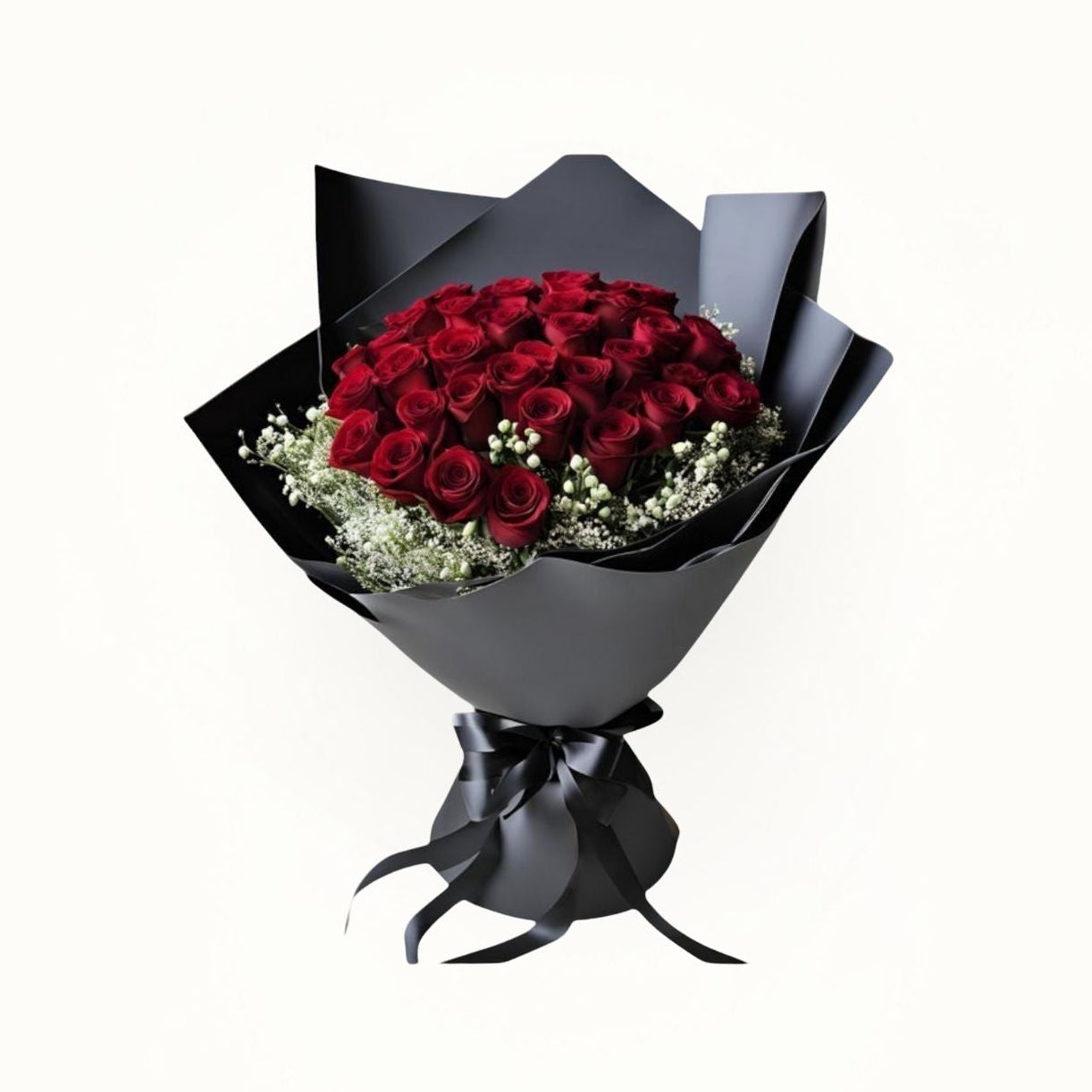 Celebrate your deepest emotions with this expertly arranged bouquet featuring 30 fresh red roses surrounded by delicate white gypsophila. Each stem is carefully hand-wrapped in elegant black paper, creating a striking contrast that enhances the vibrant colors. Perfect for expressing love with sophistication and style.